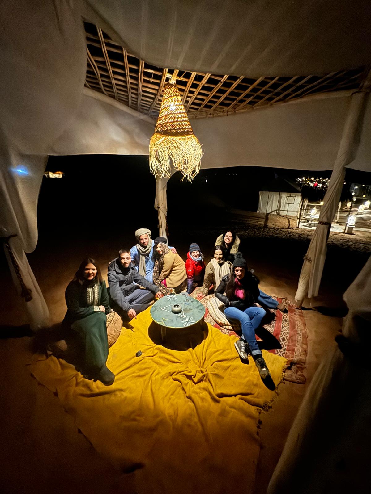 Tendremos la oportunidad de montar en camello en grupos pequeños, para contemplar este espectáculo del atardecer, en el primer día del año 2026. Cena y alojamiento en Jaimas. Tras la cena habrá fuego con la música de tambores bereberes.